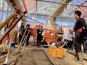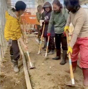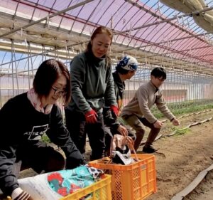 まず畑(ハウス)へ移動し、姫鍬本舗の堤より、会津の歴史から姫鍬に備わった工夫とチカラを抜いて鍬を使うためのコツについてお話しいたしました。続いて、現役農家でもある理学療法士の元木様より、筋肉や骨などの身体構造から農作業時の正しい姿勢についてレクチャーしていただきました。農作業による痛みの2トップ「腰と膝」に負荷をかけず、むしろ筋トレ効果になるか?という身体の使い方は、意識することでどんな場面にも応用が可能だそうで、とっても勉強になったようです。