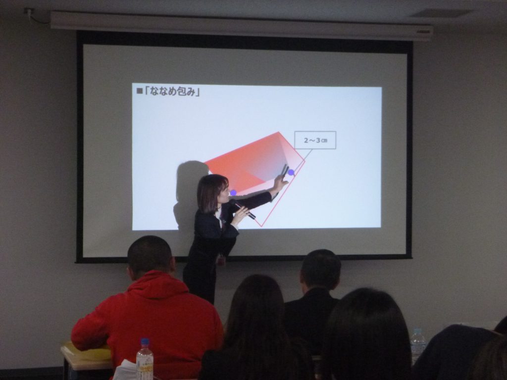 鮫島氏からは、農業女子プロジェクトの参画企業である株式会社三越伊勢丹のこれまでのあゆみから、近年の百貨店を取り巻く環境についてお話をいただき、またラッピングの目的などについて基礎知識を学んだ後、出席者は基本的なラッピング「ななめ包み」に実際に挑戦し、とても和やかな雰囲気に包まれた講座となりました。