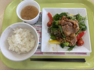当日は、配膳トレーに生産者紹介のチラシを敷いたり、テーブルには三角柱を置いたりとPRもしっかりと行いました!特別メニューを多くの皆さんにご賞味いただきたくて、庁舎内放送も両日実施。男女共同参画を伝えるために男性職員にも協力してもらい、2日目は我らが経営支援課長も登場!その甲斐あってか、2日目は1日目の総客数を超える盛況ぶりで、食堂スタッフの方も「定食の受け取り待ちの行列が長すぎて驚いた」というほどでした!